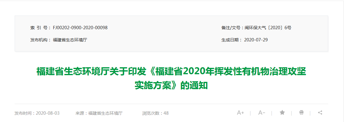 福建省2020年揮發(fā)性有機物治理攻堅實施方案