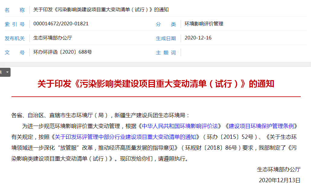 生態(tài)環(huán)境部發(fā)布《污染影響類建設(shè)項(xiàng)目重大變動清單(試行)》